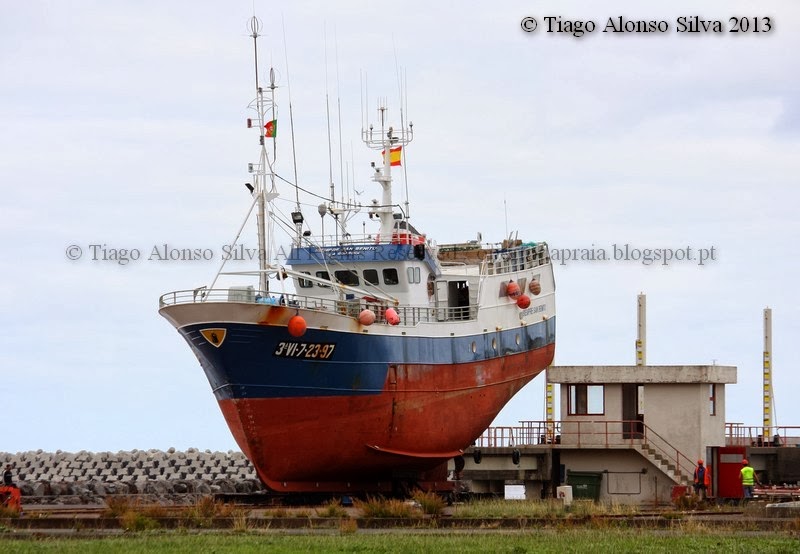 Here it goes a series of photographs of Siempre San Benito being hoisted to dry dock (Cabo da Praia Shipyard). This was a slow procedure. All precautions were made to prevent damage the ship. This manouver was made by a specialized team that included a diver. it allways good to see the shipyard had some work. My sincere thanks to the people that made these photos possible. Thank you very much.